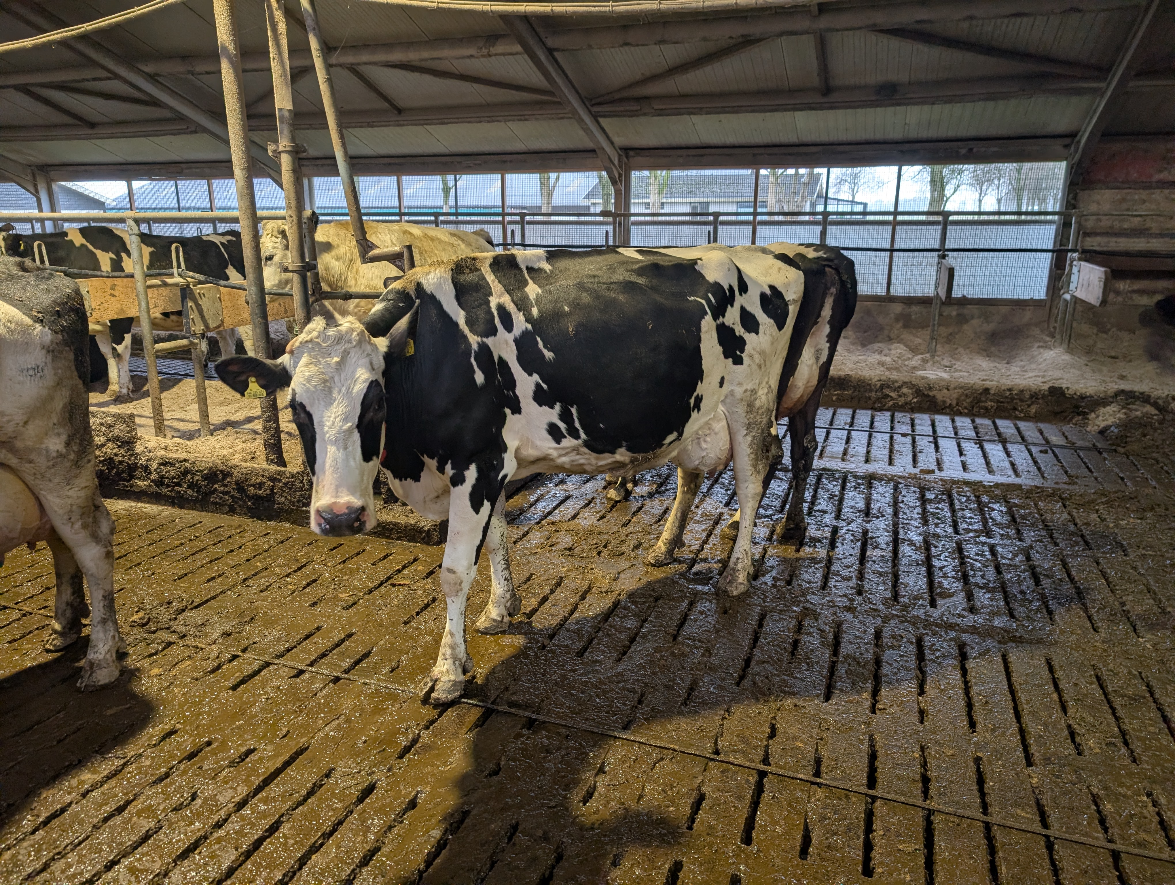 Als ze zes maanden oud zijn, leren ze in de boxen te liggen. Daar zijn ze echt al groot, met eten aan het voerhek. Ook daar kunnen ze lekker naar buiten.